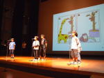 舞台の背景に写し出された大きな写真は、ジョンソン一家が動物園で撮 ったもの。2・3枚一組の写真のどちらが英文にあっているか、観客に答えてもらうゲームです。観客を巻き込んでとても盛り上がりました。 |